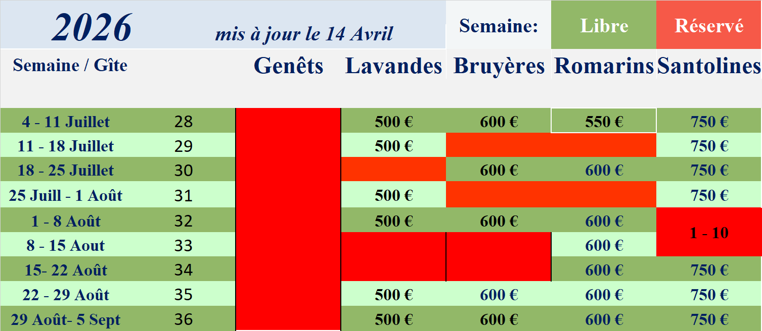 Prices : Les Lavandes and les Genêts: 50€ per night, Les Romarins and Les Bruyères: 65€ per night,  Les Santolines : 80€ per night.                                         Plus 10€ per night for the heating during winter.
